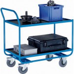Beide Ladeflächen aus MDF-Holz, Dekor beschichtet, mit Stahlrahmen eingefasst, 15 mm hoher Abrollrand. Serienmäßig pulverbeschichtet, lichtblau RAL 5012.